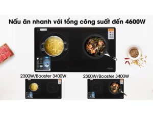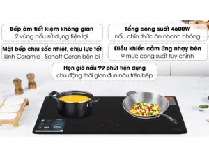 Tổng công suất 4600W, 2 vùng nấu kích thước Ø22 cm, mỗi vùng 2300W giúp nấu ăn nhanh chóng, tiết kiệm thời gian hiệu quả cho người bận rộn