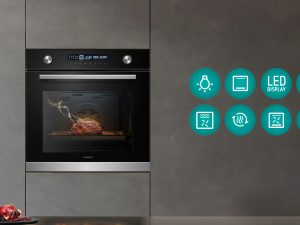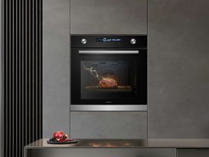 Lò nướng GX75V9 sở hữu mặt kính cường lực màu đen phối inox sang trọng, hạn chế bám vân tay và dễ vệ sinh. Thiết kế âm tủ gọn gàng, tinh tế giúp không gian bếp thêm đẳng cấp và hiện đại.